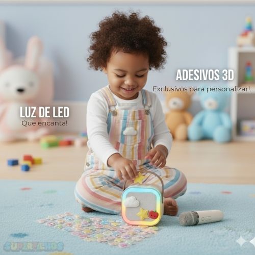 É só ligar, escolher uma música e ver o brilho nos olhos do seu filho. Com os adesivos 3D, ele cria a própria caixinha — colorida, divertida e com a carinha dele. Brincadeira vira show, e o quarto vira palco.